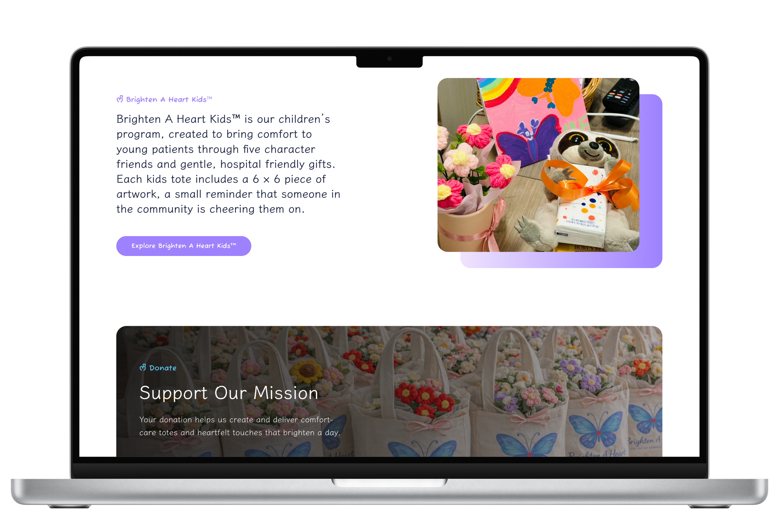 We designed a platform that radiates warmth while maintaining professional clarity. The focus was on an uplifting aesthetic and emotional imagery to highlight their initiatives—like the comfort care totes—and connect deeply with potential supporters.